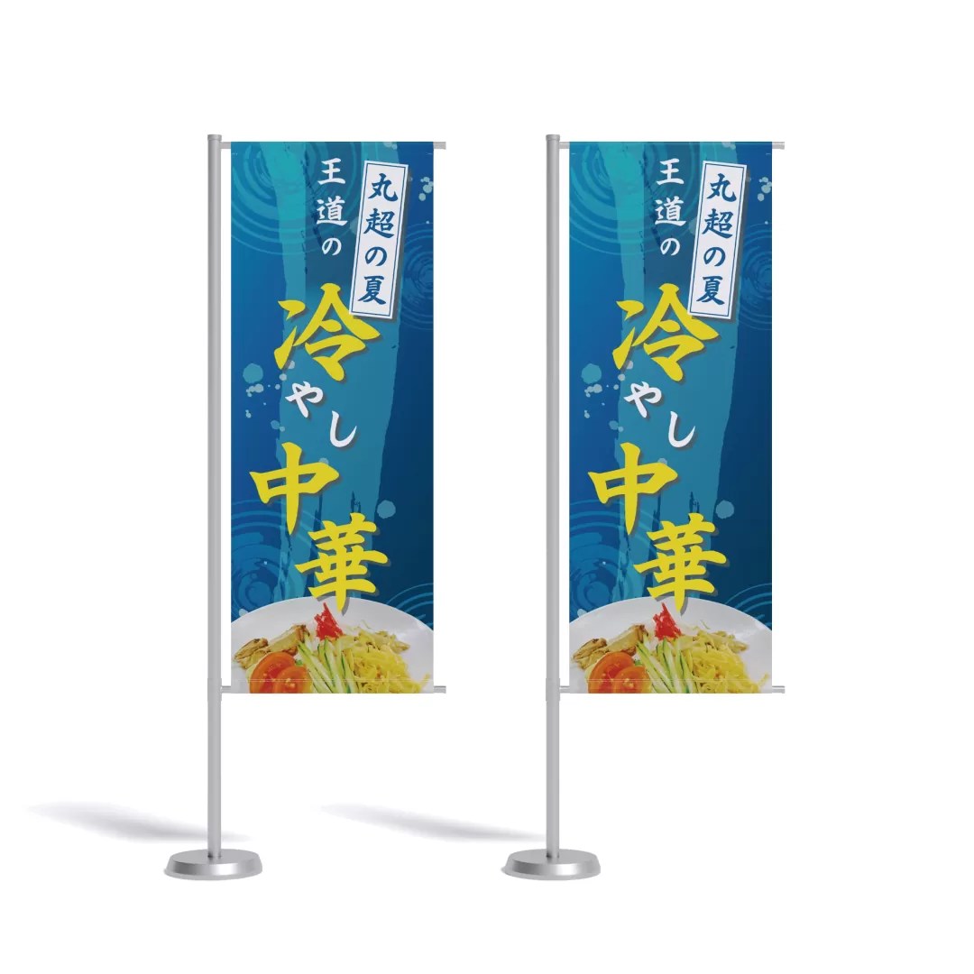 富山で人気のラーメン店「麺屋丸超インター店」様よりご依頼いただき、夏季限定メニュー「冷やし中華」の販促のぼりをデザインしました。