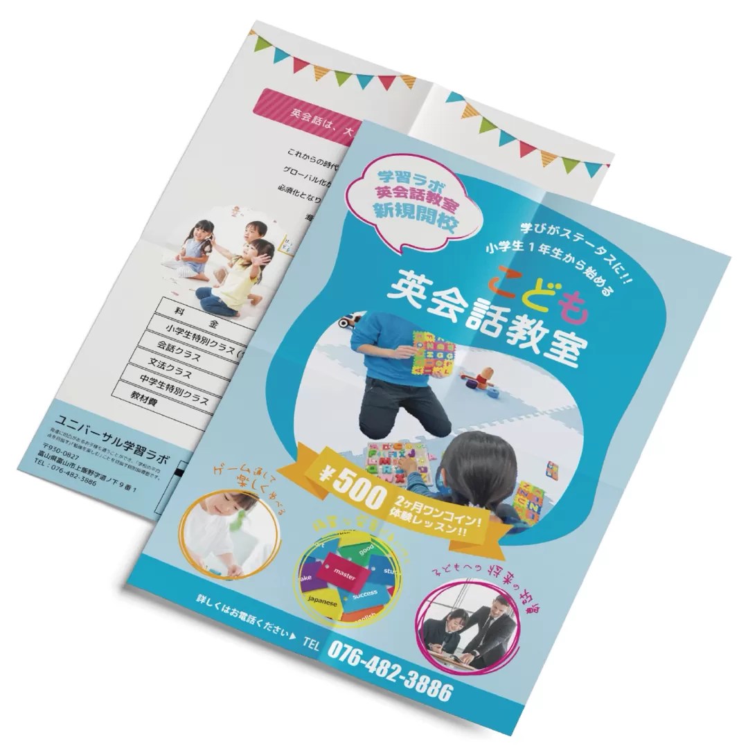 富山県にて、児童発達支援・放課後デイサービス・学習ラボなどのサービスを提供している株式会社UNIQUER様より、英会話教室のPRチラシをご依頼いただきました。普通の学習塾と異なり、ユニバーサル学習ラボは発達に凹凸があるお子様も通うことができ、「学校の平均点を目指す」「勉強を楽しむ」ことを目指す個別指導塾がテーマです。可愛らしく、シンプルなデザインを心がけて作らせていただきました。