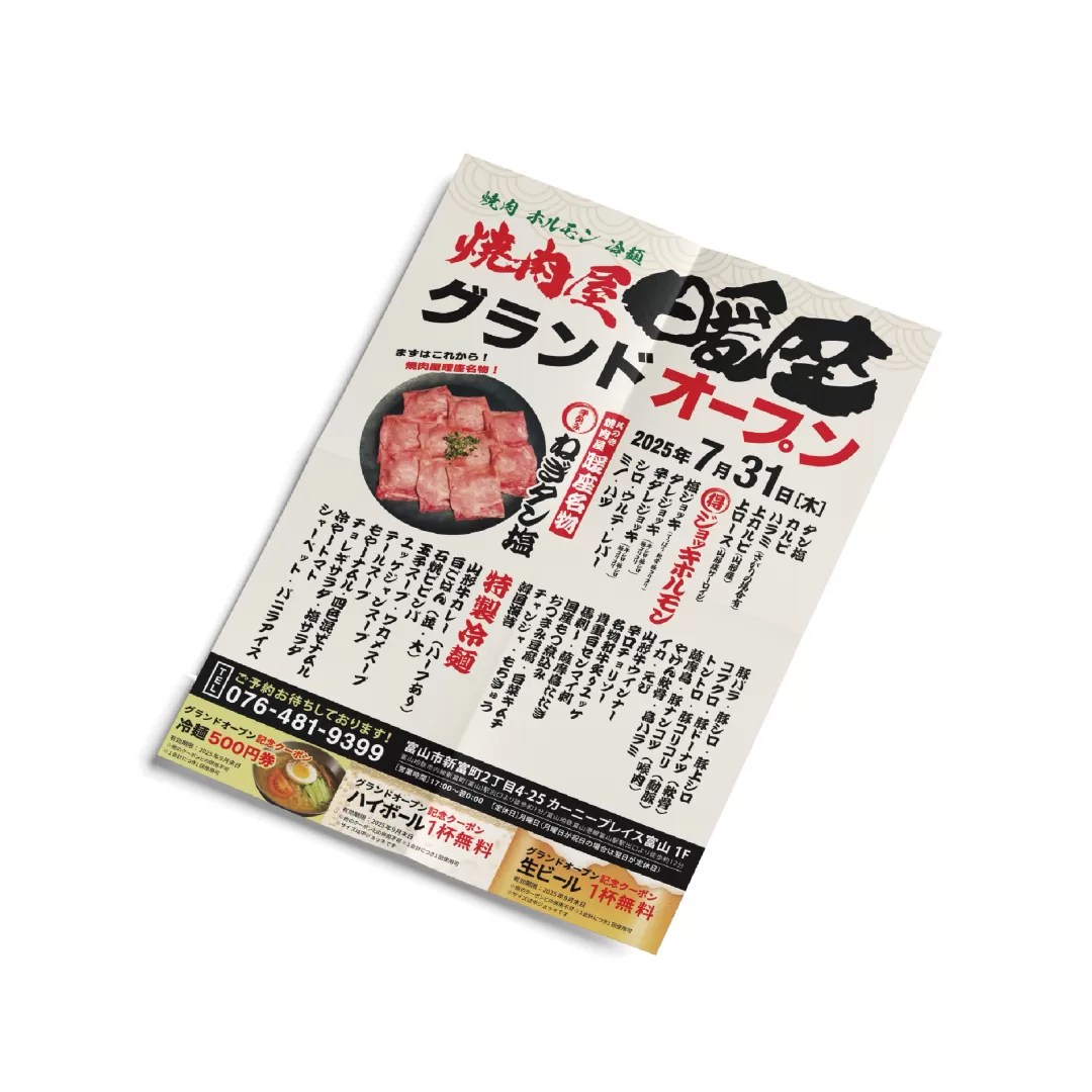 富山市に新たにオープンする「焼肉屋 暖座」様の、2025年7月31日(木)グランドオープン告知チラシをデザインしました。